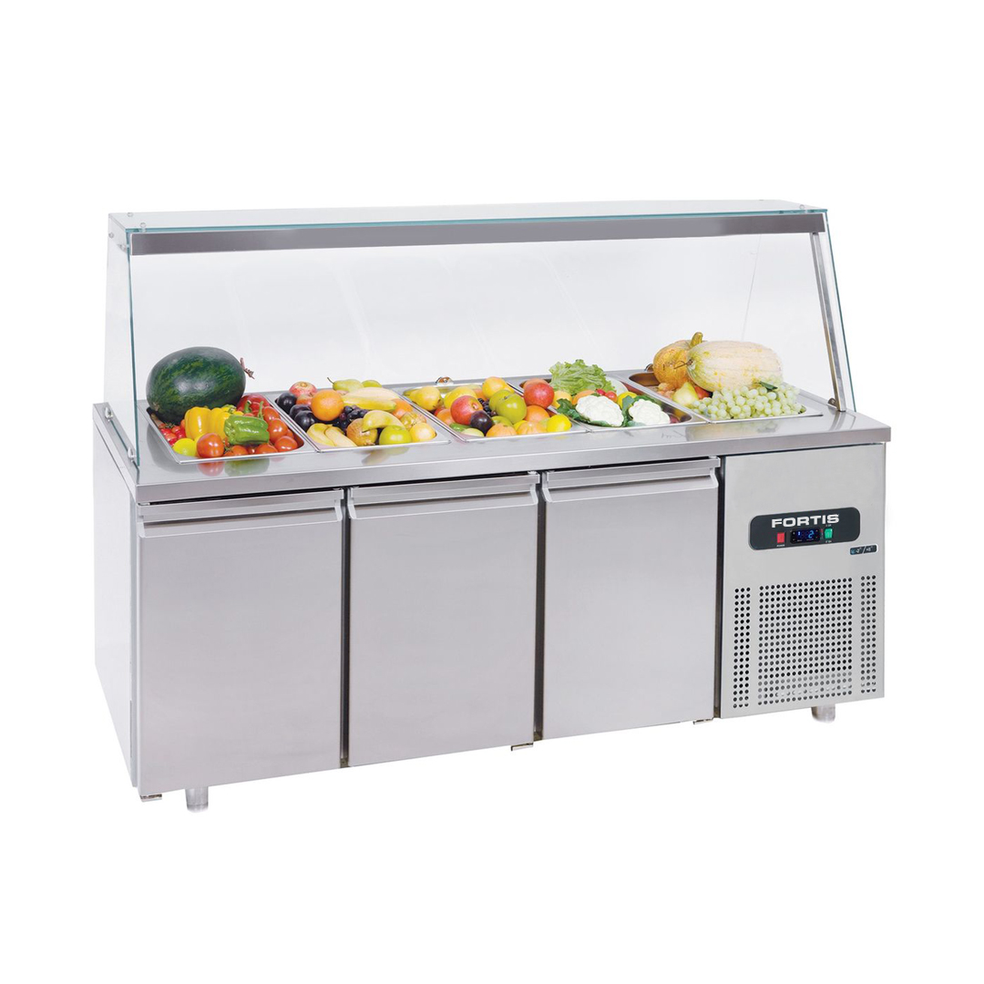 Професионална разладна работна маса со витрина од премиум Antarctica серијата на Fortis®. Овозможува практично складирање и брз пристап до свежи намирници за време на подготовка. Изработена од инокс 304 прилагодена на HACCP барањата, оваа маса е незаменлив дел од секоја професионална угостителска кујна.