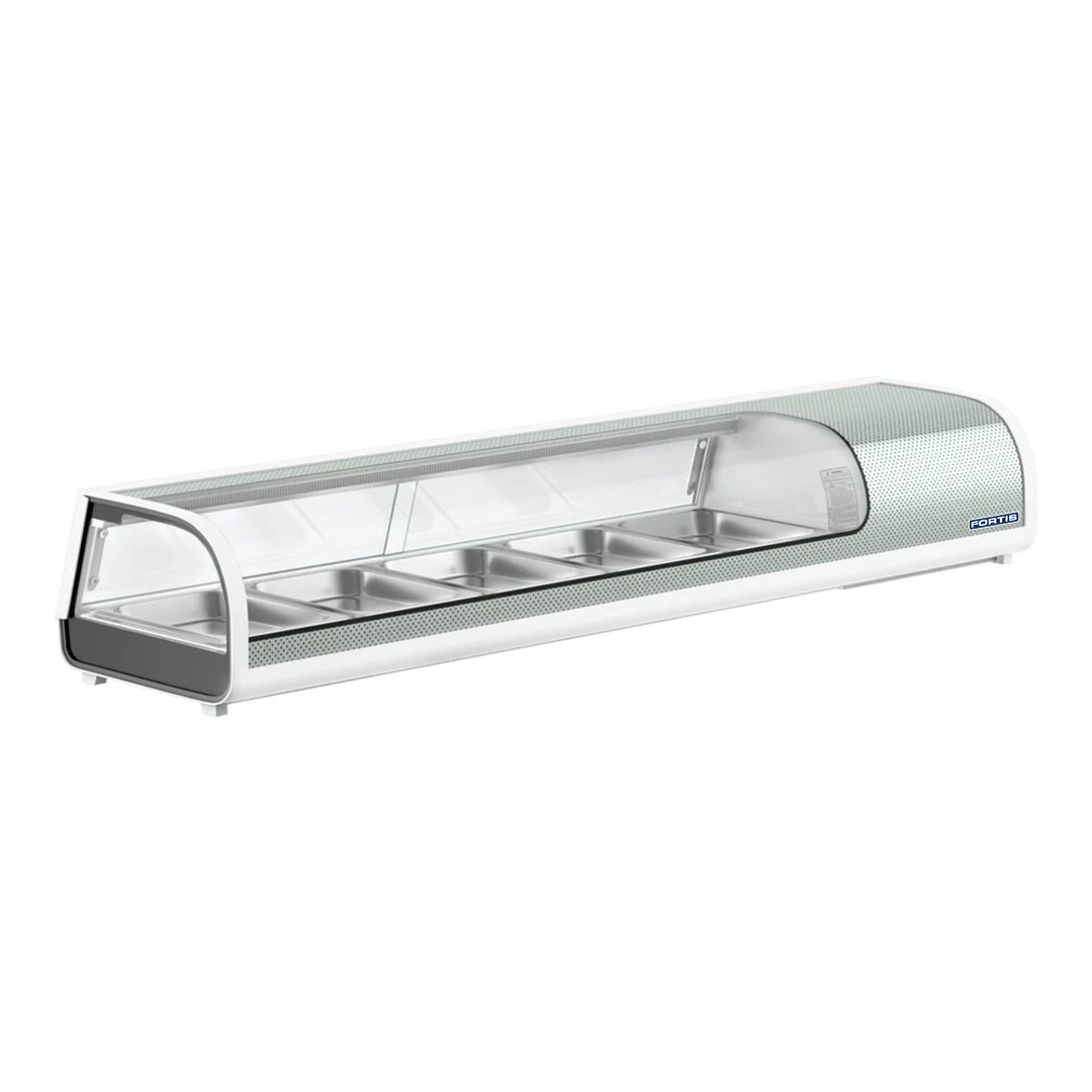 Професионална разладна витрина идеална за презентација и разладување на суши, тапас, риба и други свежи производи. Со заоблено стакло и елегантно бело куќиште, нуди модерен и луксузен изглед, совршен за поставување на пулт каде гостите лесно можат да ја видат понудата. Компатибилна е со GN садови и доаѓа со 5 x 1/3 GN садови, подготвена за употреба.