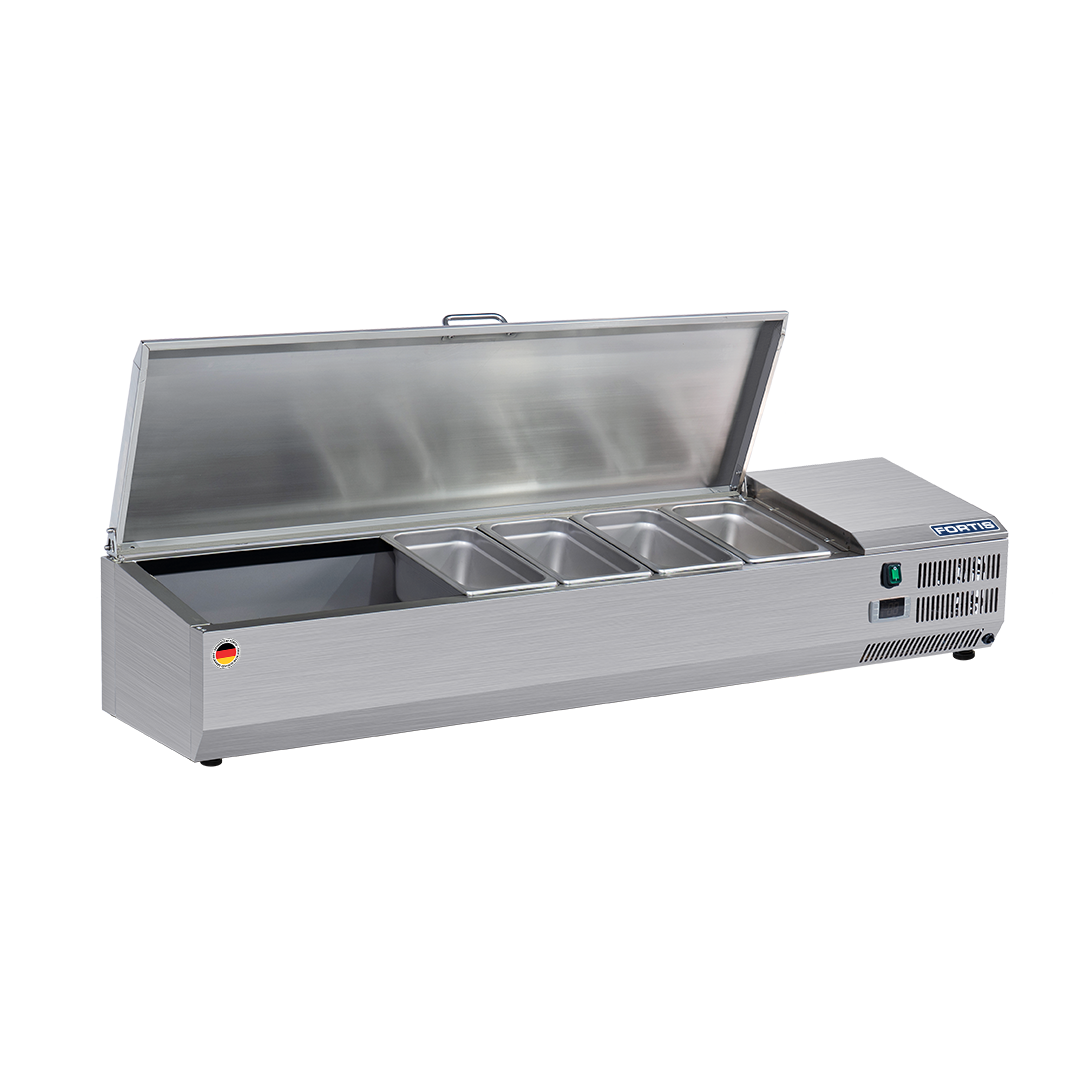 Професионален моноблок салата бар специјално наменет за брз пристап на намирници. Идеален за пицерии, ресторани или fast-food. Комплетно изработен од најквалитетен инокс по HACCP стандардни со заштитно стакло. Гастро садови (GN) не се вклучени со уредот.